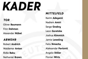 体育资讯10月02日讯 德国队公布了新一期世预赛名单,沃尔特马德、维尔茨领衔,基米希、格雷茨卡、格纳布里在列,萨内落选。