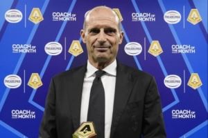体育资讯10月25日讯 意甲官方晒照,米兰主帅阿莱格里在米兰对阵比萨赛前领取了九月最佳教练奖杯。